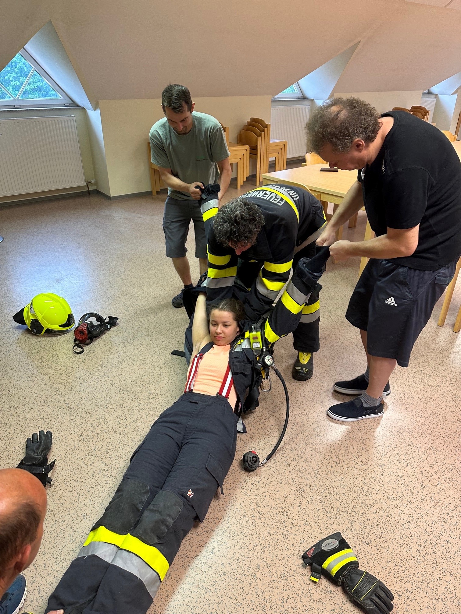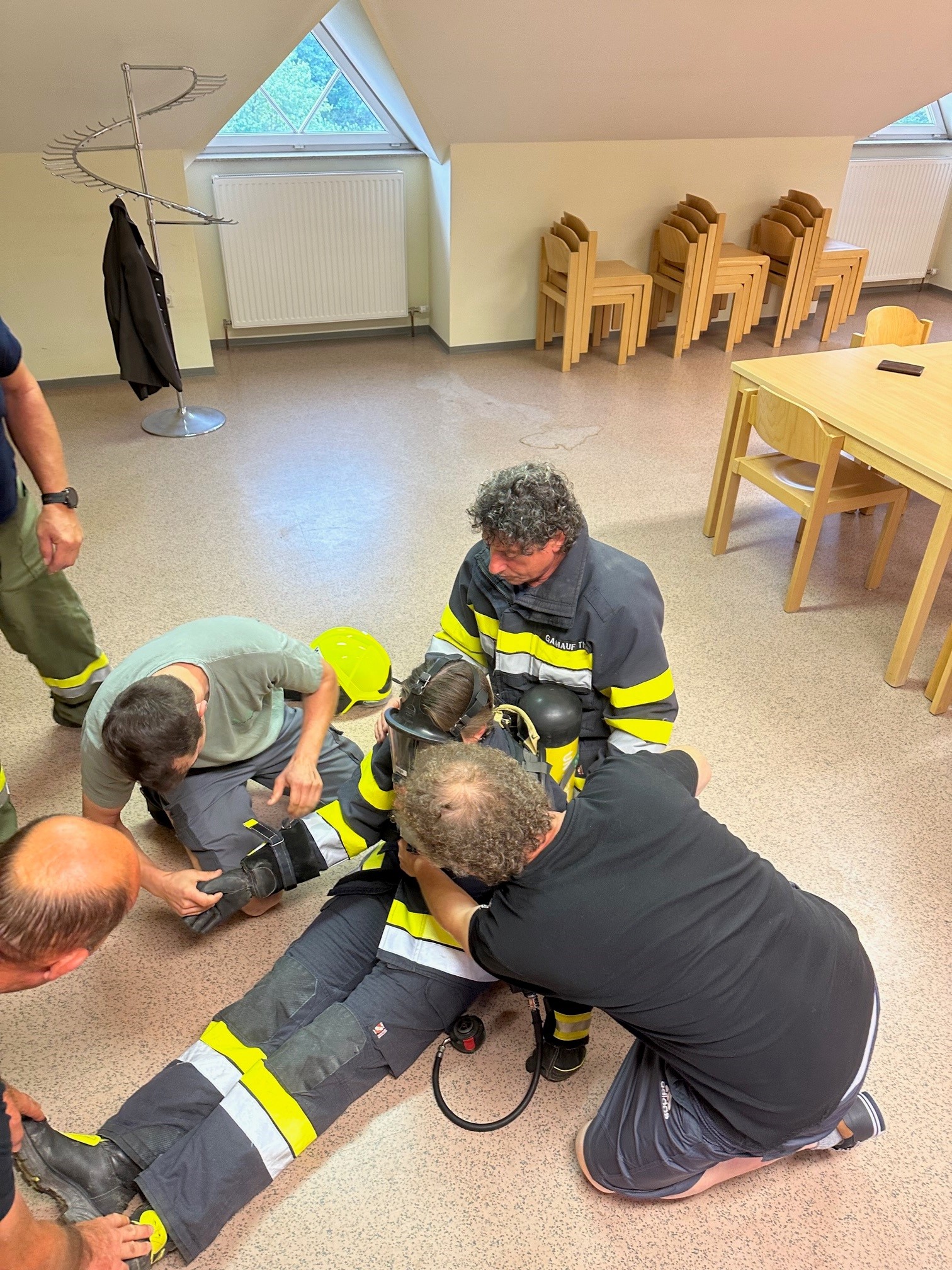 Beübt wurde ein Atemschutznotfall mit einem bewusstlosen Truppmann. Ziel war es die gesamte Atemschutzausrüstung schnellstmöglichst abzunehmen und den Truppmann in Sicherheit zu bringen.